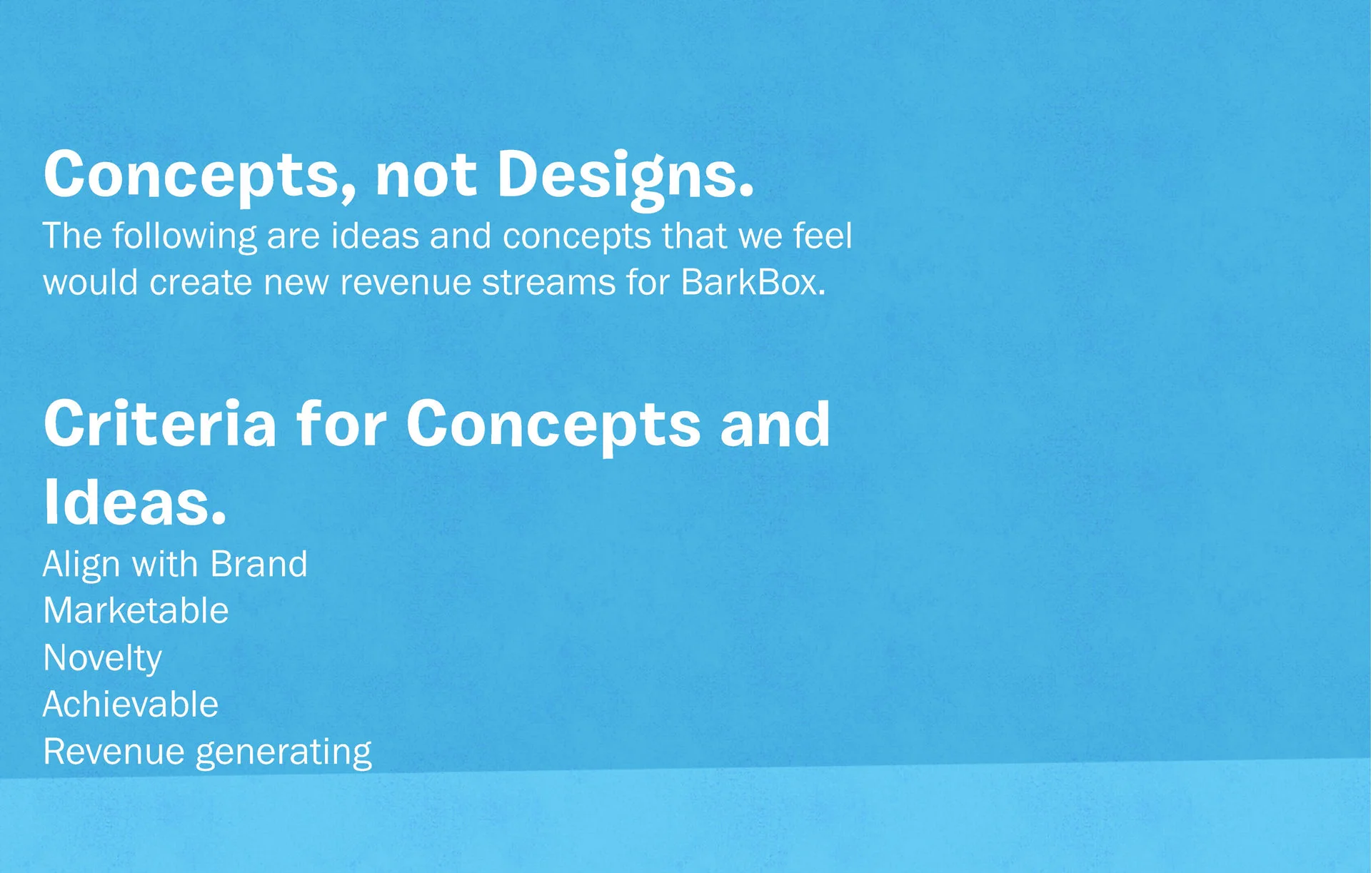 Come up with 10-12 new revenue streams for BarkBox, the beloved monthly subscription box to spoil your dog. I worked with one of the awesome founders to generate conceptual product extensions for the brand, which were presented at their annual strategy offsite. I also designed how these potential products could look and function. A selection of concepts from the presentation are below. The team went live with several of these ideas, including BarkVet (renamed “BarkCare”, an on-demand vet service) and BarkPost (a dog-centric media outlet with original content).