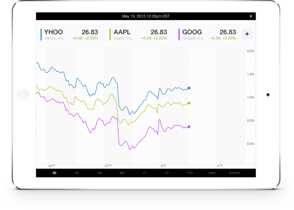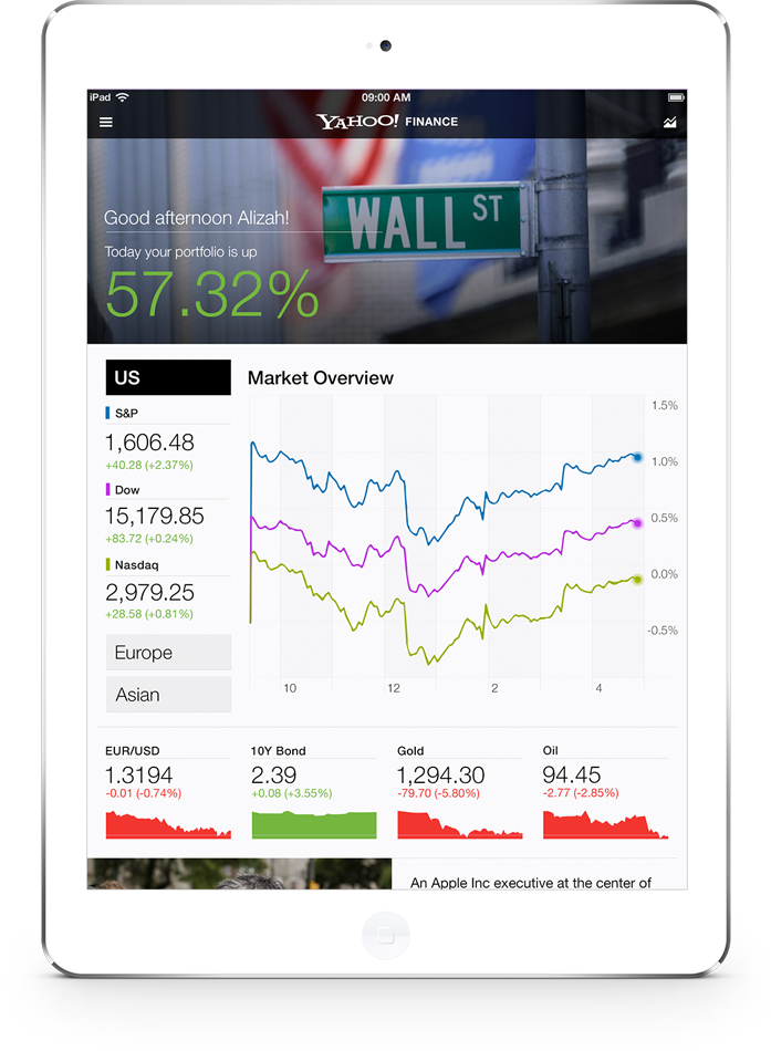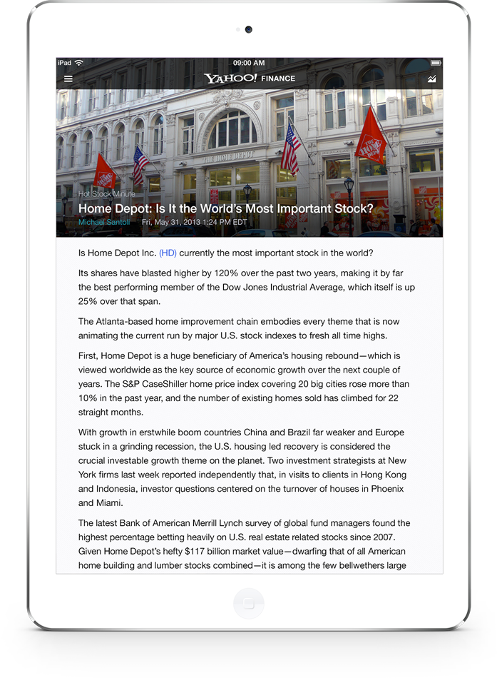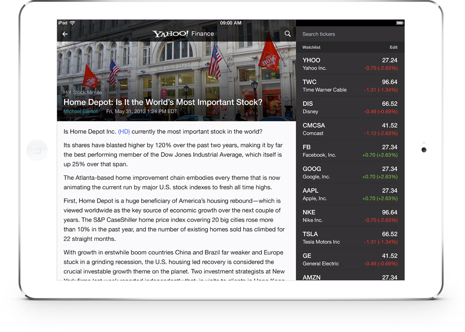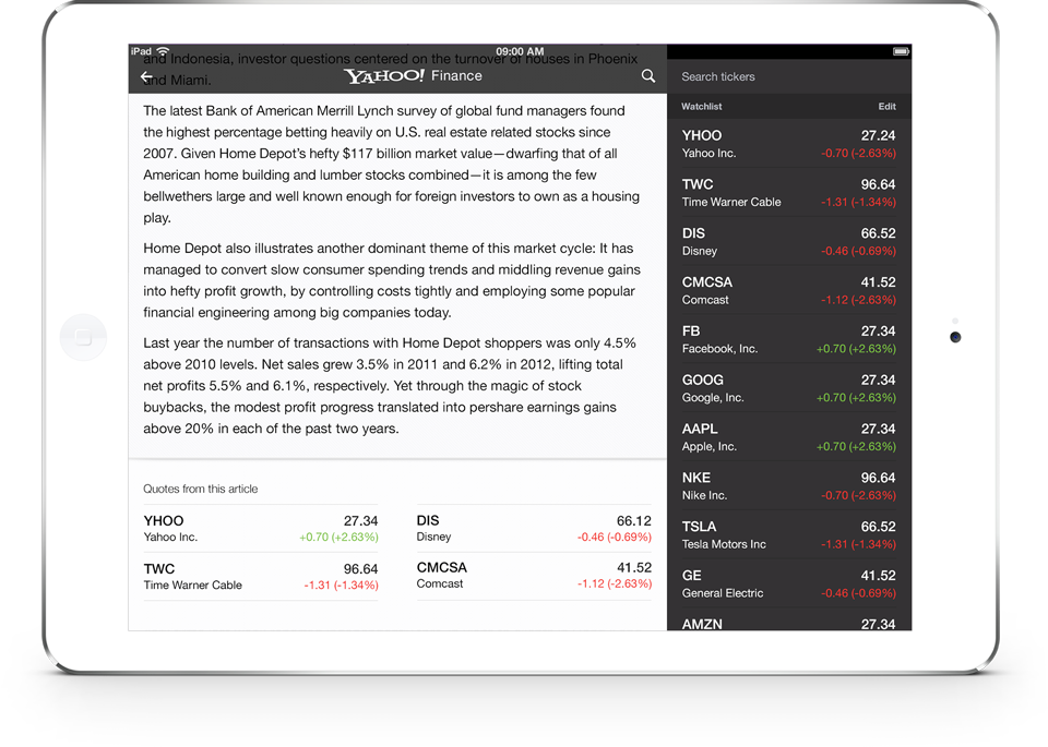 Yahoo! didn’t have an iPad app for Finance. The closest thing was a defunct app called MarketWatch. In conjunction with designing the Finance app for iPhone, I also designed the iPad version. Similarly, the goal was for it to look and feel like it fit with the new Yahoo! app and Apple-awarded Yahoo! Weather app (meaning big visuals, clean typography, and a feed of cards that contained news, stock information, etc., personalized to each individual user).