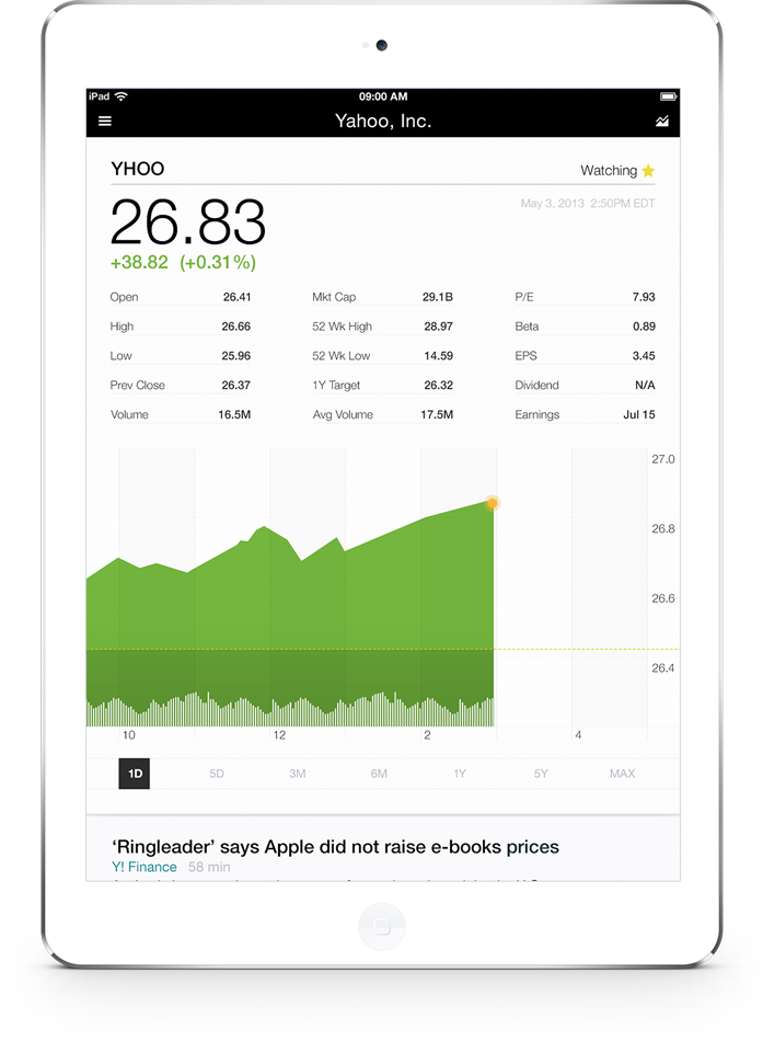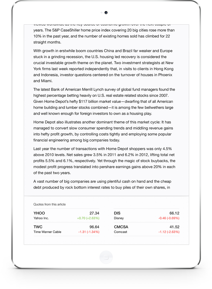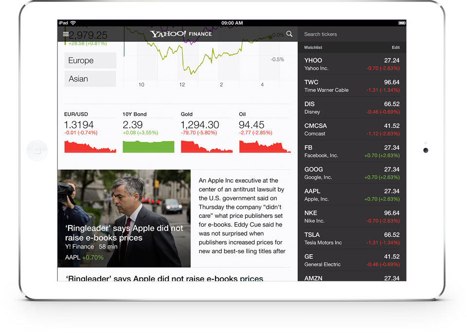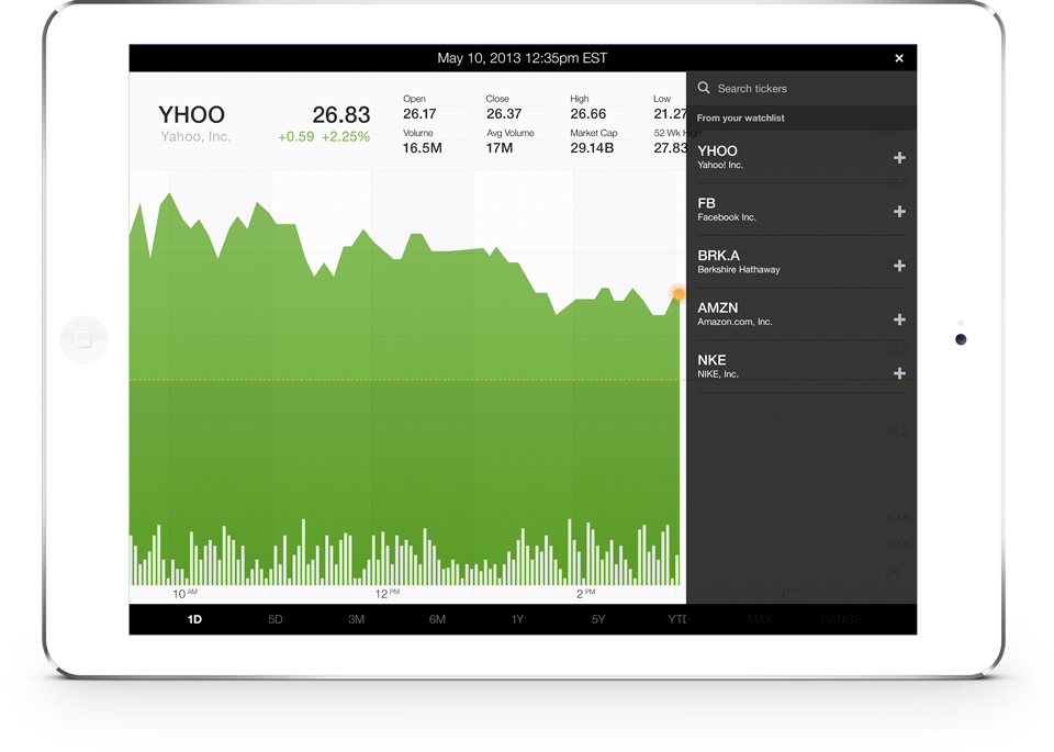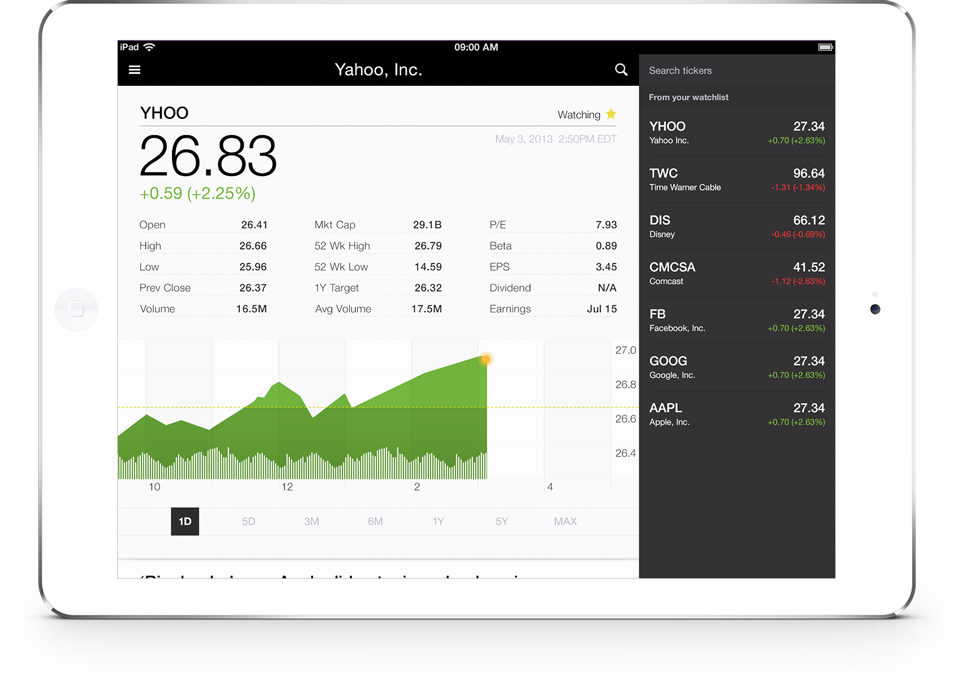 Yahoo! didn’t have an iPad app for Finance. The closest thing was a defunct app called MarketWatch. In conjunction with designing the Finance app for iPhone, I also designed the iPad version. Similarly, the goal was for it to look and feel like it fit with the new Yahoo! app and Apple-awarded Yahoo! Weather app (meaning big visuals, clean typography, and a feed of cards that contained news, stock information, etc., personalized to each individual user).